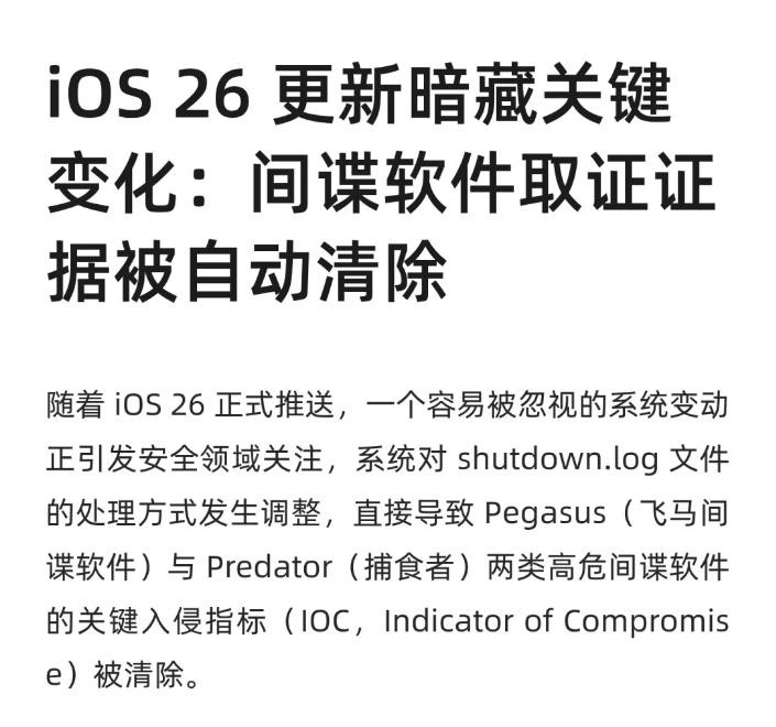 具体而言,iOS 26改变了系统处理shutdown.log文件的方式,该文件曾是检测Pegasus和Predator等间谍软件感染的关键法医证据。