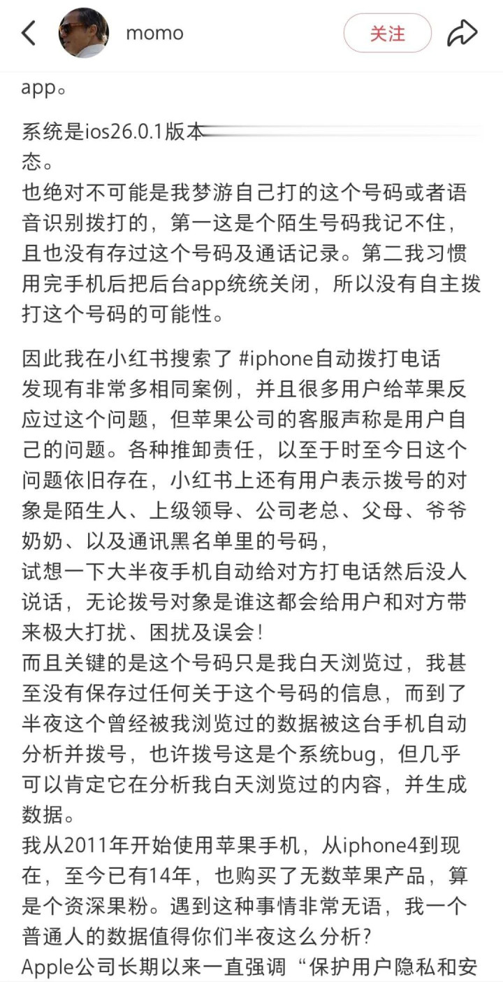 一位用户明确表示:“更新iOS 26后半夜自动拨打电话,更新前没有出现过这种情况。”